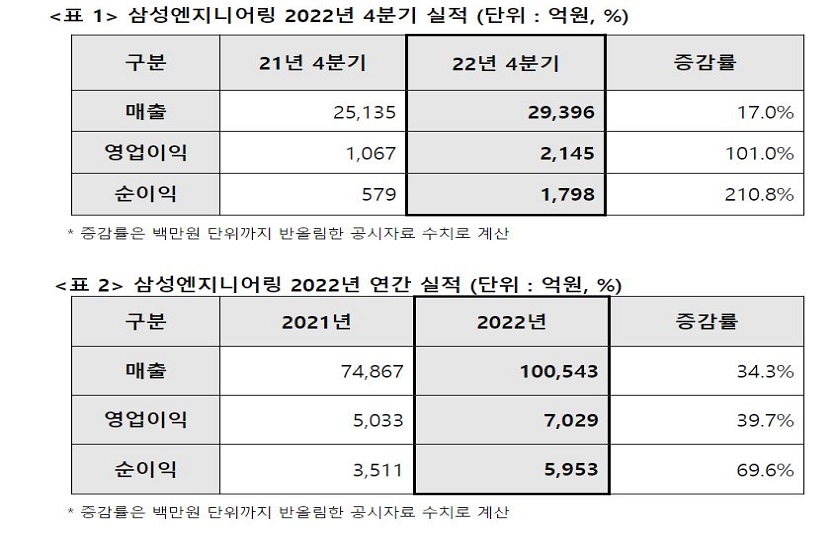 삼성엔지니어링은 연결기준 2022년 연간 실적을 잠정 집계한 결과 매출 10조543억원, 영업이익 7029억원, 순이익 5953억원을 기록했다고 공시했다.