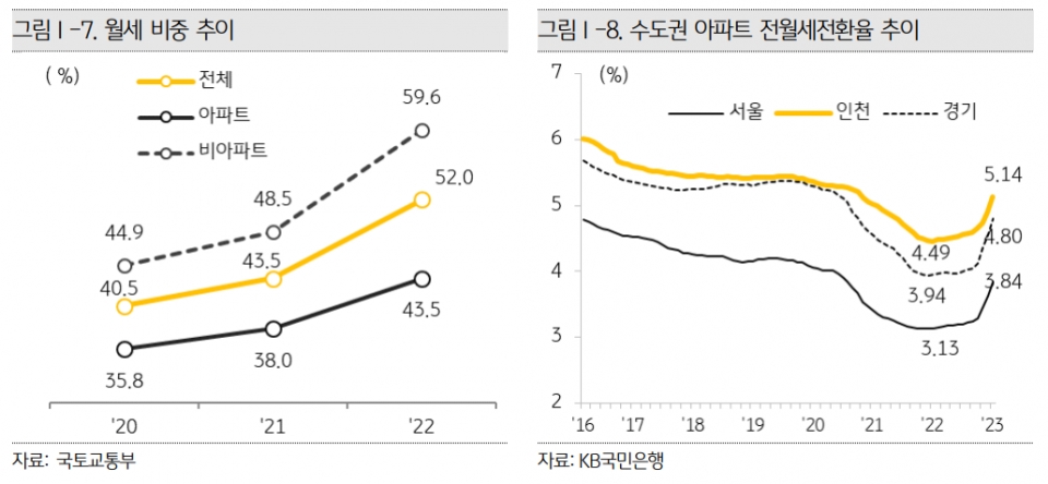 다만 KB경영연구소는 “금리 인상으로 전월세전환율 역시 상승할 수밖에 없으므로 향후 월세 증가 현상은 주춤할 것으로 예상된다”며 “전세가격이 안정되면 전세가격 상승에 따라 월세로 전환한 가구의 비중도 줄어 향후 월세 비중은 낮아질 가능성이 클 것”으로 점쳤다. 실제로 수도권 아파트 전월세전환율은 지난해 하반기부터 뚜렷한 상승세로 돌아섰다.