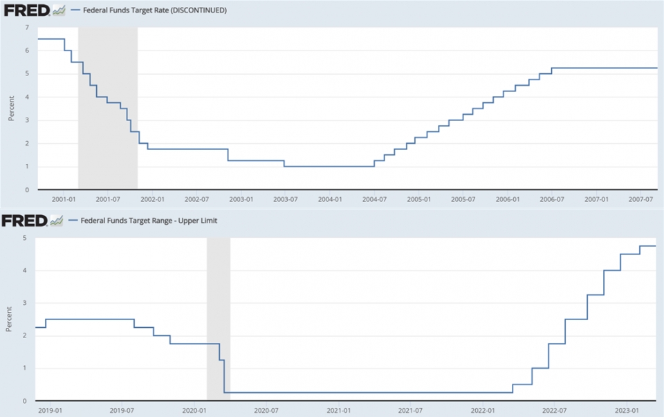 2000년대 초반 닷컴버블이 붕괴되고, 2001년 9·11 테러로 경제가 침체함에 따라 미국은 경기 부양을 위해 2003년까지 저금리 기조를 유지했다. 이에 금융시장에서 자금 조달이 용이해지며 대출이 증가했고, 부동산 시장이 과열됐다. 결국 미국 연방준비제도는 2004년 6월부터 2006년 7월까지 기준금리를 1.00%에서 5.25%로 인상했다.