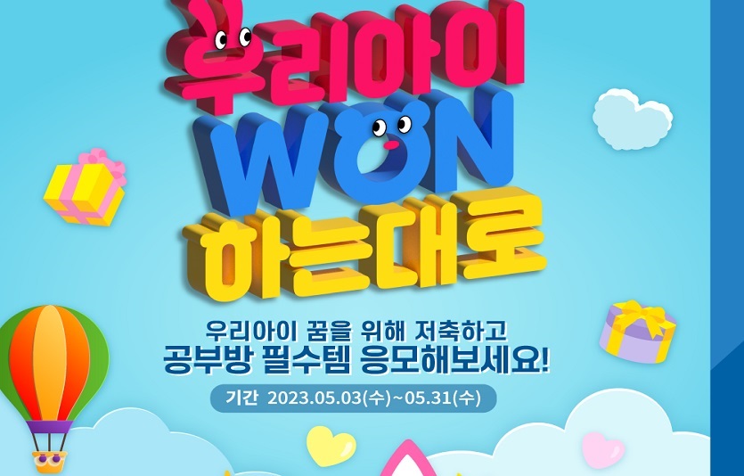 [이지경제=윤현옥 기자] 우리은행(은행장 이원덕)은 5월 어린이날을 맞이해 초등학생 이하 자녀를 둔 부모를 대상으로 ‘우리아이 WON하는대로’ 이벤트를 이달 3일부터 실시한다고 밝혔다.