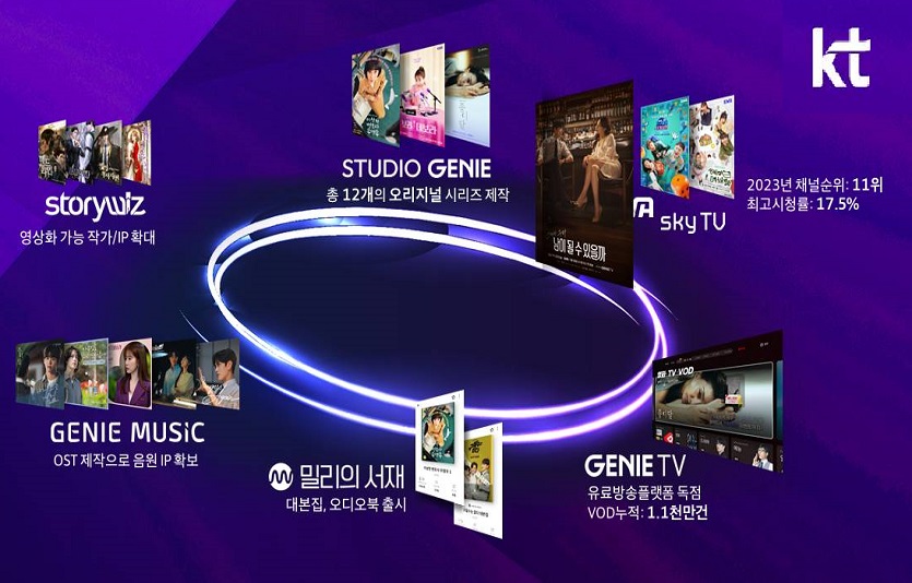 드라마VOD-대본집-오디오북-OST 등으로 이어지는 선순환 구조에 힘입어, 지난해 KT그룹 콘텐츠 분야(KT스튜디오지니, ENA, 지니뮤직, 밀리의서재, 스토리위즈)에서 약 5000억원의 매출을 달성했다. 콘텐츠 분야를 포함한 2022년 KT그룹 전체 미디어매출은 전년도 대비 9% 가량 성장한 4.2조원으로, 2025년까지 5조원 매출 달성이 기대된다.