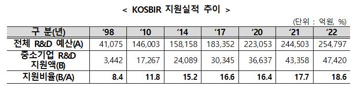 중소기업 기술혁신지원제도가 도입된 이후, 중소기업 R&D 지원규모는 1998년 3442억원에서 2022년 4조 7420억 원으로 대폭 증가하는 등 중소기업의 기술혁신 저변확대를 이끌어왔다.