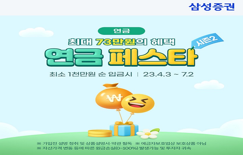 삼성증권(사장 장석훈)이 7월2일까지 최대 73만원의 혜택을 받을 수 있는 ‘연금저축 Festa’와 ‘IRP Festa’ 이벤트를 진행한다.