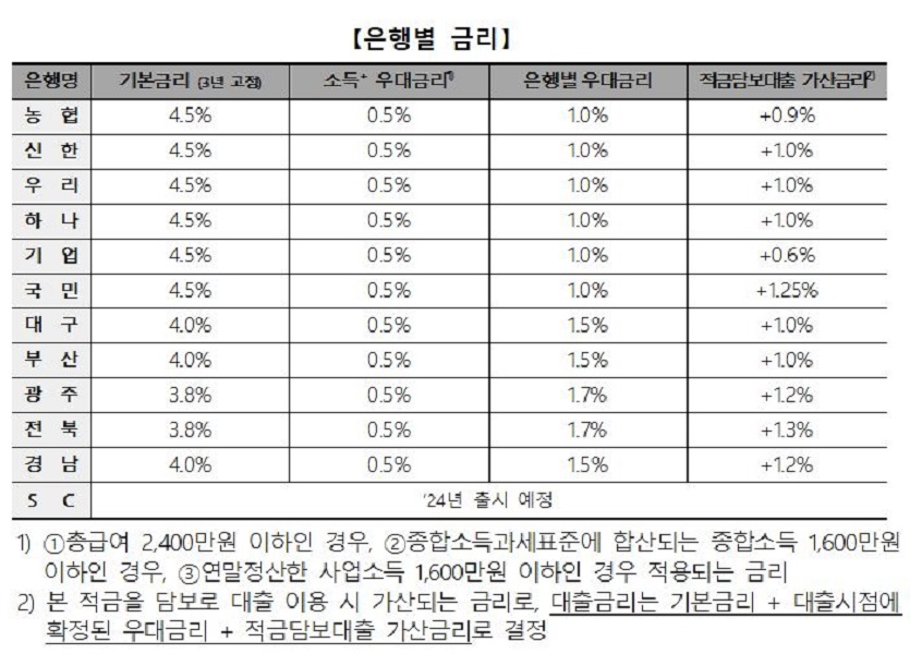 15일 가입신청이 시작되는 청년도약계좌 확정금리는 은행연합회 홈페이지에 공시됐고, 은행별 우대금리 세부항목 비교표도 함께 게재했다. 은행별 확정금리는 홈페이지내 소비자포털→금리/수수료 비교공시→예금상품금리비교→청년도약계좌 금리비교에서 확인할 수 있다.