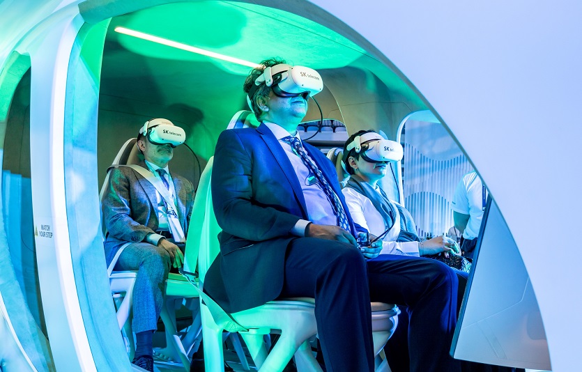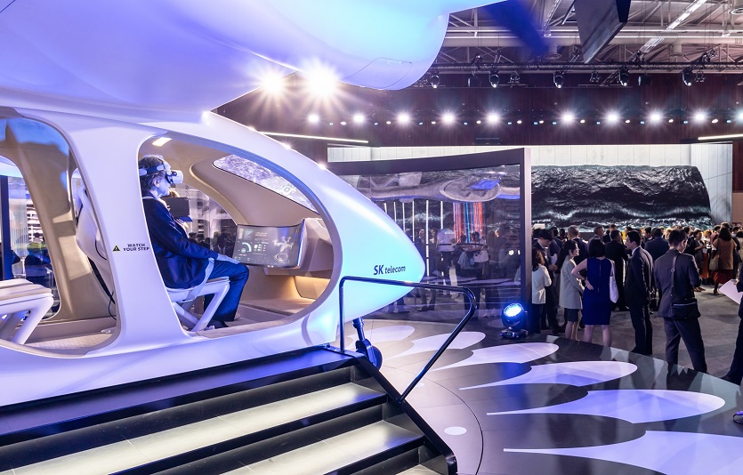 SKT의 실감형 전시 콘텐츠는 올해 국제전자제품박람회(CES 2023)와 모바일 월드 콩그레스(MWC 23)에 출품돼 세계 각국의 관심을 받은 바 있다. 실물 크기로 제조된 UAM 모형에 올라 VR 장비를 착용하면 부산세계박람회가 열리는 2030년 부산시 상공을 비행하는 듯한 체험을 할 수 있다.