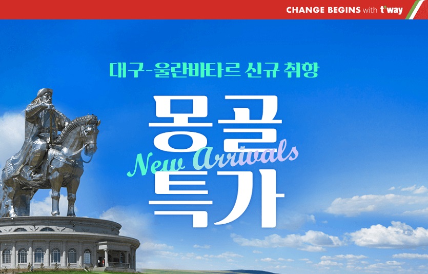티웨이항공은 이달 28일 대구에서 출발하는 울란바토르(몽골) 노선 신규 취항을 앞두고 홈페이지와 모바일웹(앱)에서 10일부터 이달 23일까지 특가 프로모션을 선보인다고 10일 밝혔다.