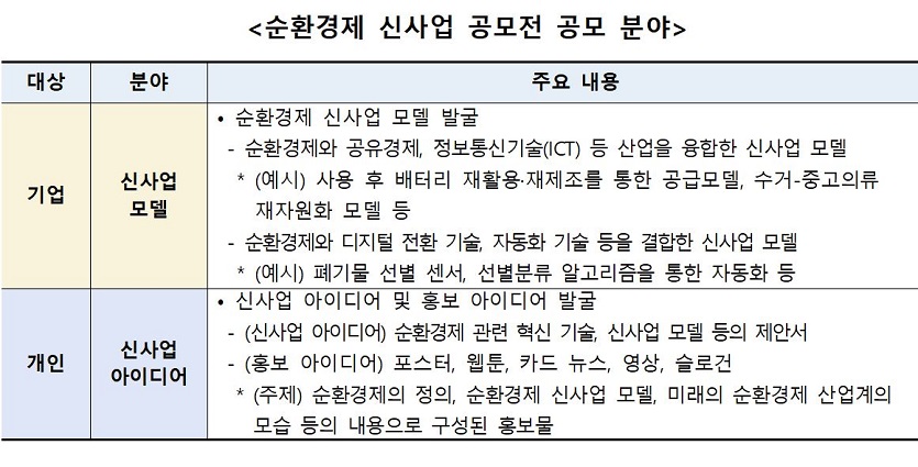 공모 분야는 기업이 신기술, 서비스 등이 결합한 사업모델을 개발·실증한 것을 제안하는 ‘신사업 모델’ 부문과 개인이 포스터, 영상, 구호(슬로건) 등 순환경제에 관한 홍보 아이디어를 제안하는 ‘신사업 아이디어’ 부문이 있다.