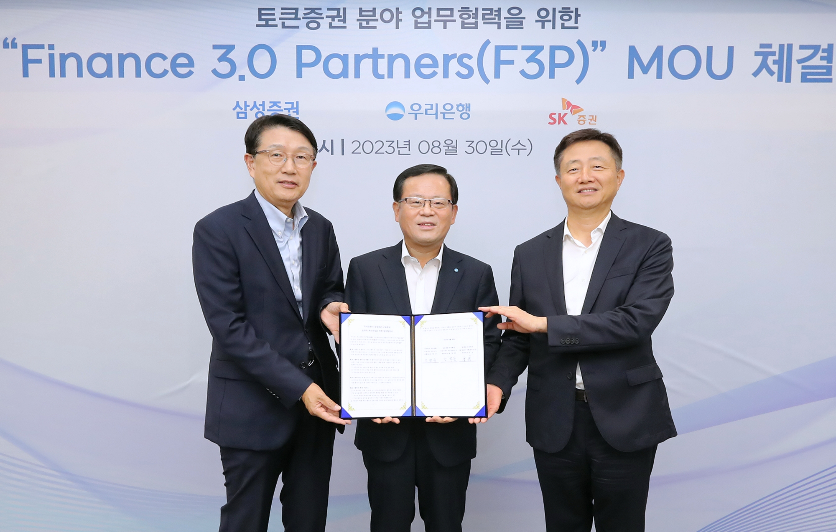 조병규 우리은행장과 장석훈 삼성증권 대표이사, 김신 SK증권 대표 등이 참석한 가운데 진행한 업무협약식에서 우리은행을 포함한 3사는 ▲토큰증권 비즈니스 모델 공동발굴과 제도 준수 ▲토큰증권 인프라 구축과 분산원장 공동 검증 ▲투자자 보호방안 수립 등 상호협력 협의체인 파이낸스 3.0 파트너스(이하 F3P) 구성에 합의했다.