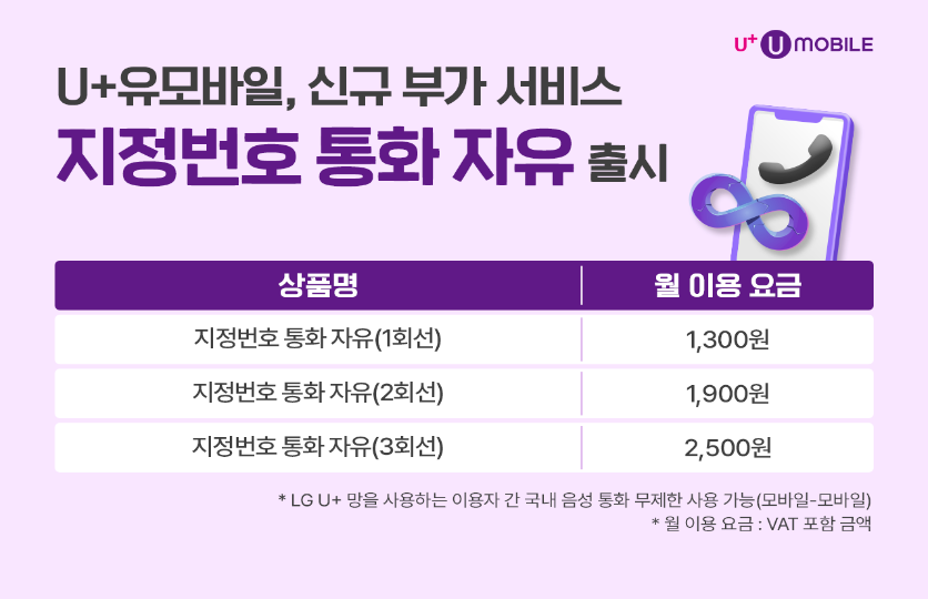 고객은 LG U+망을 사용하는 모바일 무선번호 1개~3개 회선을 지정해 무제한 국내 음성통화가 가능하다. 1개 회선을 지정할 경우 이용요금은 월 1300원, 2개 회선 월 1900원, 3개 회선은 월 2500원이다.