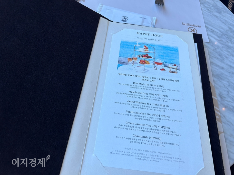 차는 TWG컬렉션으로 ▲1837블랙티 ▲프렌치 얼 그레이 ▲그랜드 웨딩 티 ▲바닐라 버번 티 ▲크림 카라멜 티 ▲카모마일 중에 선택 가능하며 커피류도 가능하다.