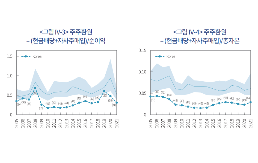 주주환원율은 순이익 중에서 주주가치 제고를 위해 사용되는 자사주매입과 주당배당금이 얼마나 되는지를 나타낸다. 이로 인해 상장기업의 자산가치를 평가하는 주가순자산비율(PBR)은 4개국 중 가장 낮은 0.9배에 불과해 자산가치 보다 주가가 낮게 평가되고 있다는 지적이다.