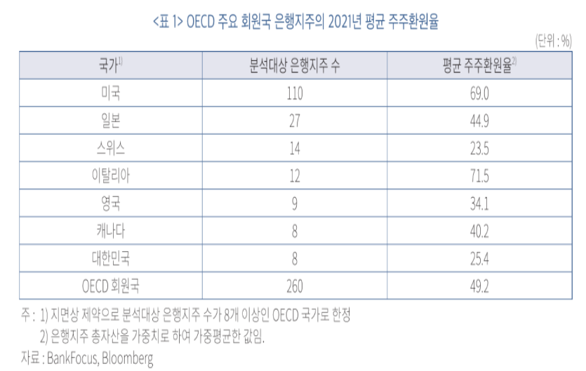 서병호 한국금용연구원 선임연구위원도 "국내 은행지주의 주주환원율은 OECD 회원국 은행지주 대비 상당히 낮기 때문에 주주환원율 제고는 은행주 가치 제고에 기여할 수 있을 것으로 예상된다"고 말했다.