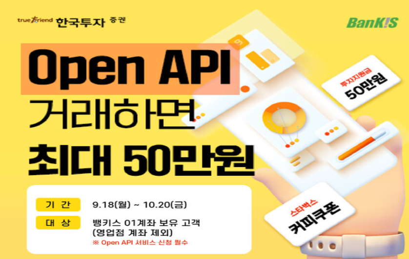 한국투자증권 오픈API에 가입한 뱅키스 고객을 대상으로 이벤트도 진행한다. 10월20일까지 오픈API로 코스피·코스닥 상장종목(ELW 제외)을 1억원 이상 매매한 고객에게 커피 쿠폰을 제공한다. 10억원 이상 매매 고객에게는 금액에 따라 최대 50만원의 투자지원금을 지급한다.