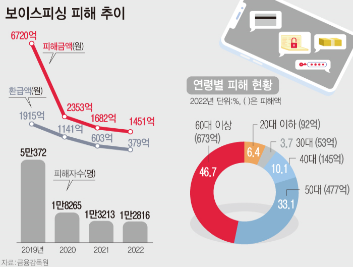 금융감독원이 발표한 ‘2022년 보이스피싱 피해현황 및 주요 특징’에 따르면 지난해 보이스피싱(계좌이체형) 피해금액은 1451억원으로 전년 대비 13.7%(231억원) 감소했다.