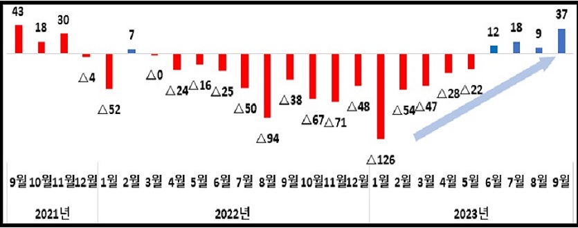 9월 무역수지는 최근 2년 내 최대 흑자규모인 +37억 달러를 기록하며 4개월 연속 흑자흐름을 보였다.
