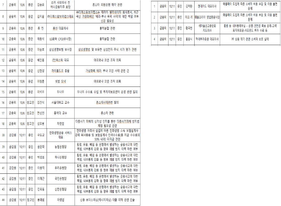 이에 반해 2022년 국감 당시 정무위의 일반 증인·참고인은 총 44명을 기록했다. 이 중 금융위·금감원의 일반 증인은 15명이었으며 5대 은행장이 금감원 증인 명단에 포함됐다.