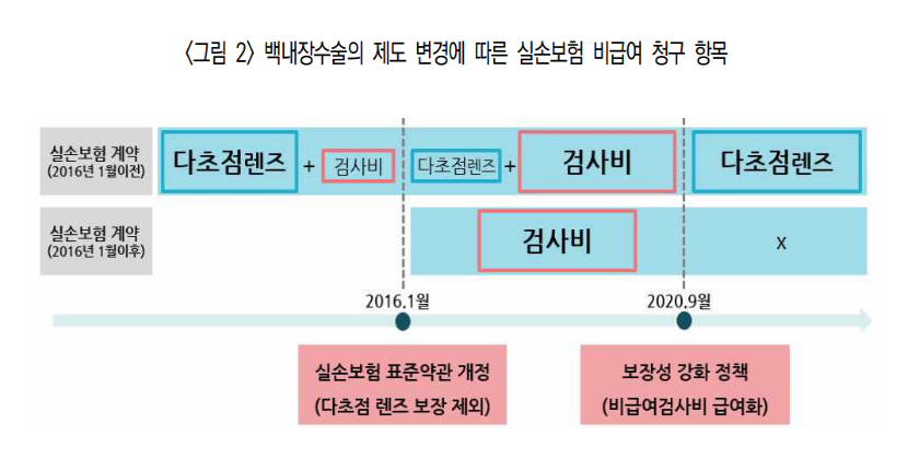 지난해 금융당국은 일부 의료기관의 백내장 과잉 진료 등으로 손해율이 높아졌다며 보험금 누수 방지를 위한 특별 대책을 발표했다. 또한 대법원의 '입원 치료가 불필요한 경우 백내장 보험금을 통원 기준으로 지급하라'는 취지의 판결로 최대 보험금 지급 한도가 1500만~2000만원에서 회당 25만원 수준으로 줄었다.