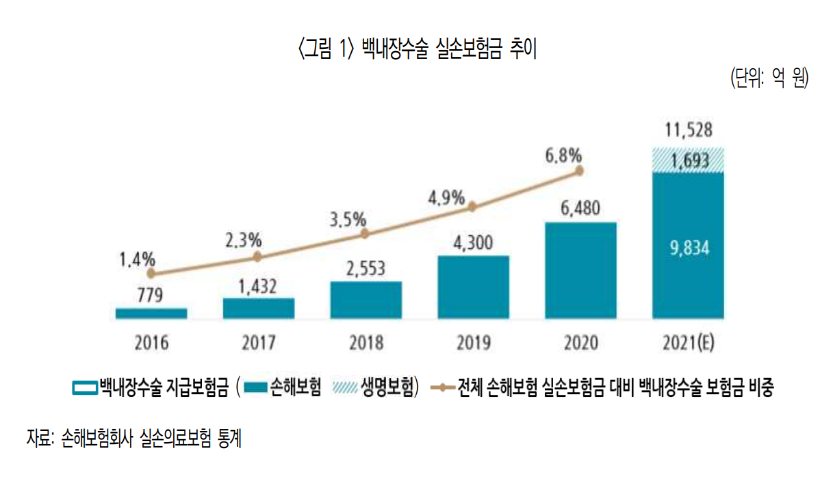 보험업계에 따르면 몇몇 병원들이 백내장수술을 받아 수정체 대신 다초점 렌즈를 끼면 시력이 좋아진다는 식으로 홍보를 했고, 최대 1400만원에 이르는 수술비용에도 실비보험 처리가 돼 백내장 수술이 늘어났다. 이에 지난 2016년 780억원 정도였던 실손보험금 청구가 5년 만에 1조원에 다다르는 등 급격하게 증가했다.