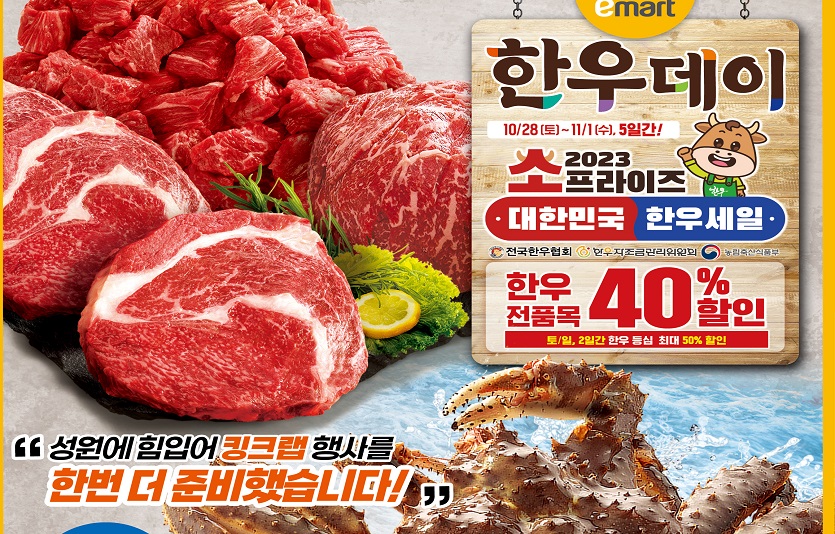 ‘한우데이’에 맞춰 28일부터 11월1일까지 5일간 한우(냉장) 전품목 대상으로 행사카드 전액 결제시 40% 할인해준다. 특히 고객 선호가 높은 ‘한우 등심’ 부위는 토/일요일 양일간만 기존 40% 할인에 추가로 10% 할인을 더 적용해 최대 50% 할인 판매한다.