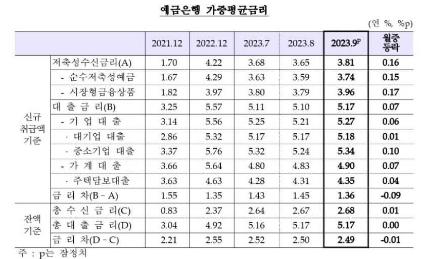 전체 대출·예금금리도 3개월만에 증하해...예금금리 3.81%, 8개월 내 최고