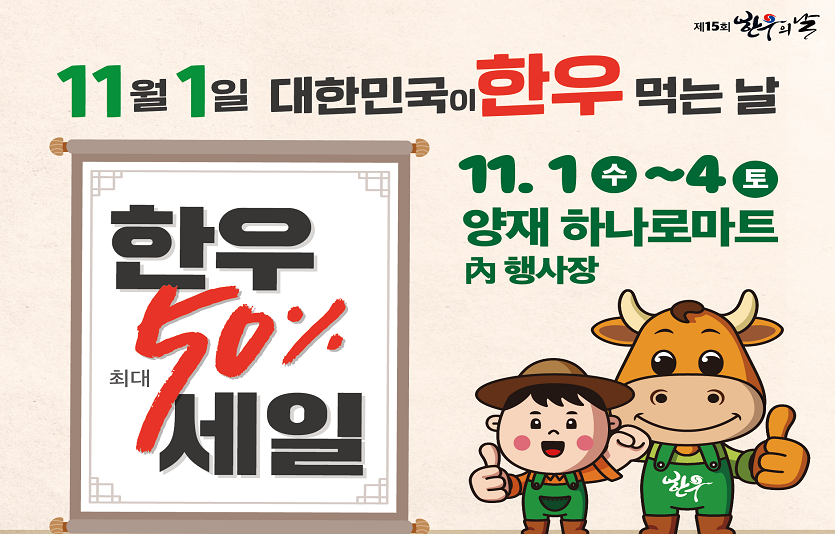 11월1일 서울 하나로마트 양재점에서는 한우버거를 비롯해 한우 토르망치 바비큐 등 한우요리 시식회와 한우스테이크 푸드트럭이 운영되며 2023 한우문화공모전 시상식과 공연 이벤트도 진행된다.