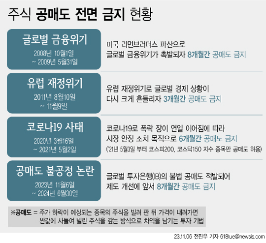 금융위원회는 지난 5일 정부서울청사에서 '공매도 전면금지' 브리핑을 열고 6일부터 내년 6월 말까지 유가증권·코스닥·코넥스시장 전체 상장 종목에 대한 공매도를 금지한다고 밝혔다.