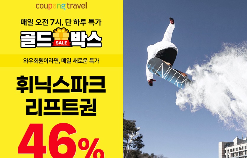 [이지경제=윤현옥 기자] 쿠팡이 와우 회원 전용 할인코너인 ‘골드박스’에서 11월6일 ‘휘닉스파크 리프트권 2종’을 최저가로 단독 선판매한다고 밝혔다.