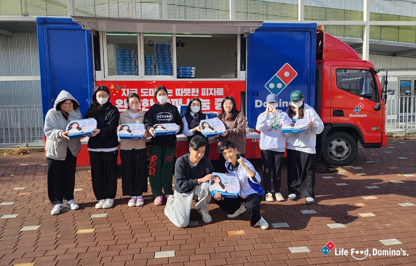 도미노피자는 지난 6일 2024 수학능력시험을 앞두고 경기도 남양주시 동화고등학교 고3 수험생들에게 파티트럭을 통해 피자를 전달했다고 밝혔다.