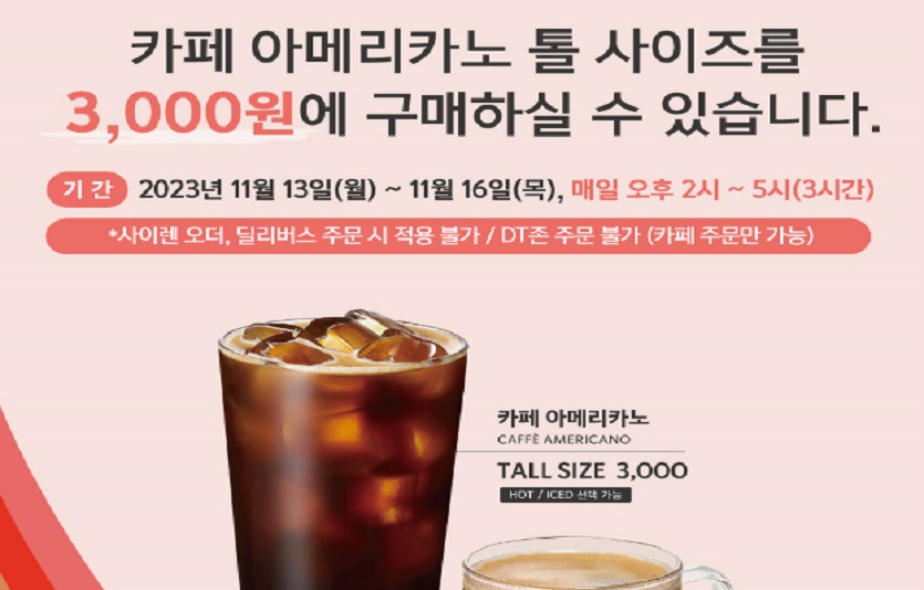 이마트에서는 19일에 생생치킨 1통을 5980원에 판매하고 스타벅스는 13일부터 16일까지 4일간 오후 2시부터 5시까지 아메리카노(톨 사이즈)를 3000원에 판매한다.