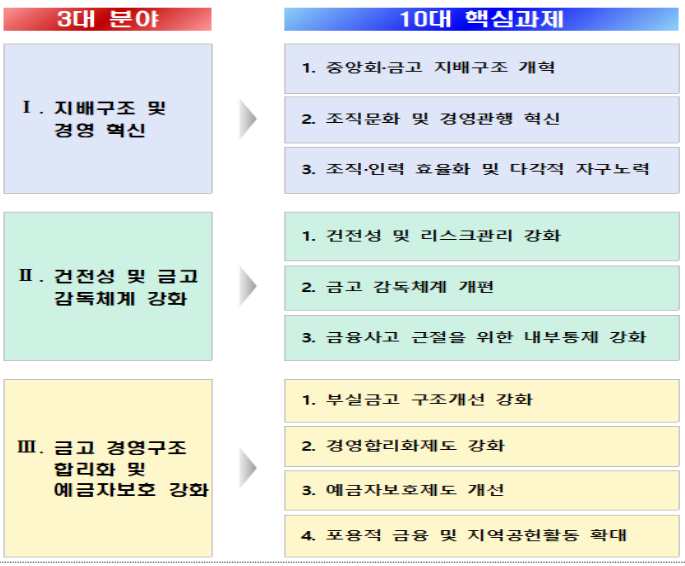 혁신안은 ▲지배구조 및 경영 혁신 ▲건전성 및 금고 감독체계 강화 ▲금고 경영구조 합리화 및 예금자보호 강화 등 3대 분야 10대 핵심과제를 기반으로 한 세부 항목으로 구성됐다.