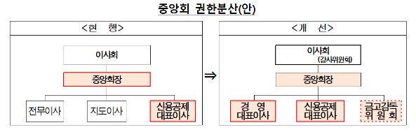 중앙회장의 과도한 권한을 분산과 단임제 전문경영인체제 도입이 이번 혁신안의 핵심이다.