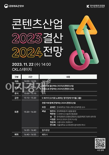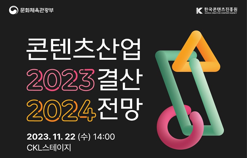 문화체육관광부와 한국콘텐츠진흥원(이하 콘진원)은 엔데믹과 디지털 대전환, 글로벌 경기침체 속 콘텐츠산업의 가치와 기회를 조망하는 ‘콘텐츠산업 2023 결산 2024 전망 세미나’를 22일 서울 중구 CKL스테이지에서 개최한다고 16일 밝혔다.