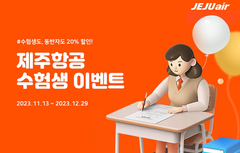 대입 수험생 할인 혜택은 탑승일을 기준으로 내년 2월23일(성수기 제외)까지 제주~김포·부산·청주·광주·대구, 김포~부산 등 국내선 모든 노선을 대상으로 수험생 본인과 동반자 1인에 한해 정규운임 기준 20%의 할인혜택을 제공한다.