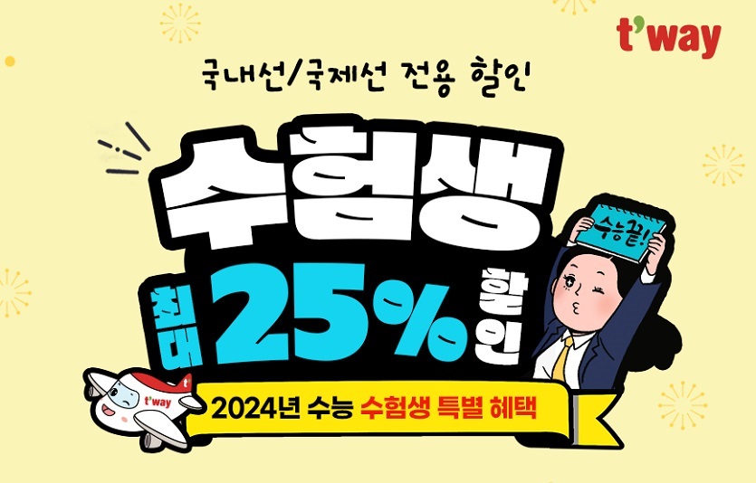 티웨이항공은 수능을 치른 수험생들을 격려하기 위해 ‘2024년 수능 수험생 최대 25% 할인 프로모션’을 실시한다.