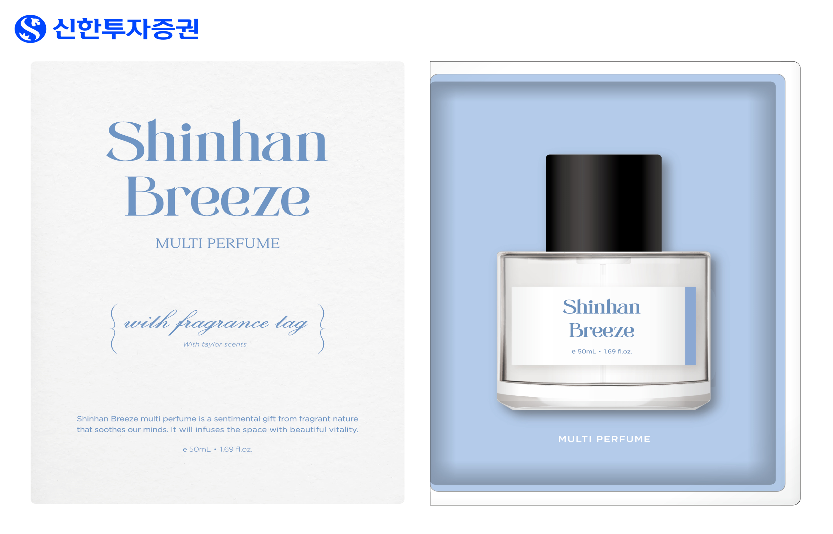 신한투자증권은 이달부터 고객용 신한브리즈 멀티퍼퓸을 출시해 지점에 방문하는 고객들에게 사은품으로 제공하고 있다. 고객용으로 제작된 신한브리즈 멀티퍼퓸은 옷과 차량용 시트, 공간 등 다양하게 활용할 수 있는 다용도 탈취제로 동물성 원료를 사용하지 않은 비건 레시피로 제작됐다.