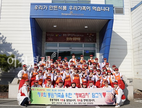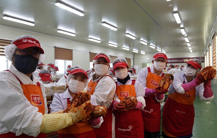 민은홍 동원산업 사업 부문 대표를 비롯한 60여 명의 임직원과 해상 직원의 가족들은 지난 21일 충북 진천에 위치한 동원F&B 진천공장에서 제9회 ‘동원 가족을 위한 행복 김치 담그기’ 행사에 참여했다.