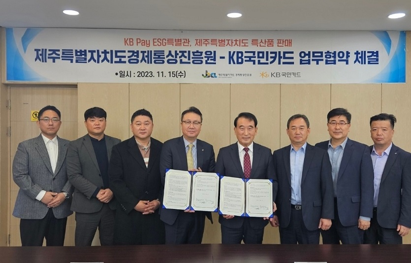 KB국민카드는 지난 15일 제주특별자치도 경제통상진흥원에서 KB국민카드 이호준 상무와 제주 경제통상진흥원 오재윤 원장이 참석한 가운데 KB Pay 쇼핑을 통한 제주도 특산품 판매를 지원하는 업무협약을 체결했다.