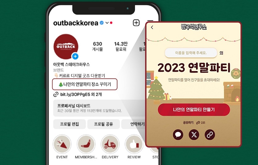 12월10일까지 ‘2023 연말파티’참여 인증샷을 인스타그램 스토리에 해시태그에 맞춰 올리면 푸짐을 경품을 증정하는 이벤트도 연다. 아웃백 디지털 기프트 카드 10만원권(50명), 아웃백X위글위글 콜라보 2024 다이어리킷(500명)과 아웃백 커르르패밀리 카카오 이모티콘(1000명) 등이 준비돼 있다.