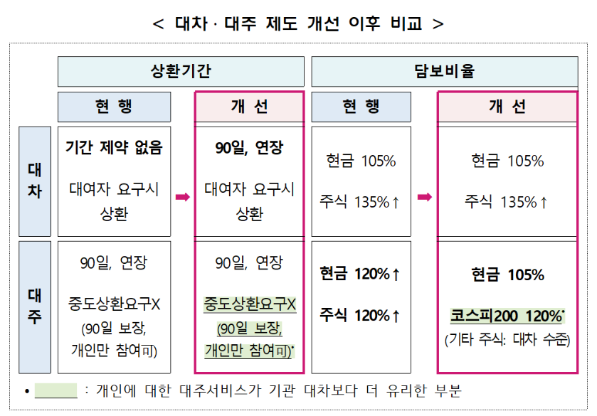 개인투자자의 공매도를 위해 제공되는 대주 물량은 증권금융이 대차 등을 통해 빌린 주식 등으로 구성돼 있다. 이 상태에서 대차거래의 연장을 제한하면 증권금융이 대주 재원을 마련하기 위한 주식을 차입하는 데 어려움이 발생해 대주 서비스에 대해서도 현행 '90일+연장'안을 유지하기 어려워진다.