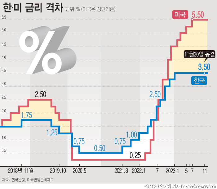 한국은행은 지난해 전례 없이 빠른 속도로 인상해 온 금리를 올해엔 그대로 유지한 채 그 여파와 주요국의 긴축 행보를 지켜봤다. 올해 1월 단 한 차례 25bp(1bp=0.01%포인트) 인상한 것을 제외하고 모든 금통위 회의에서 동결 결정을 내렸다.