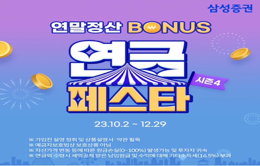 [이지경제=정석규 기자] 삼성증권이 '연금 페스타 시즌4' 이벤트를 12월29일까지 진행한다고 밝혔다.