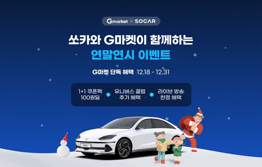 [이지경제=윤현옥 기자] G마켓이 이달 31일까지 ‘쏘카와 G마켓이 함께하는 연말연시 이벤트’를 열고 쏘카 쿠폰팩 100원딜을 단독으로 진행한다고 27일 밝혔다.