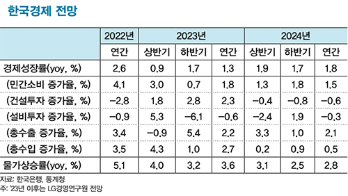 연구원은 또 수출 회복세도 시차를 두고 나타날 주요국 통화 긴축의 누적 효과, 미국·중국 경기 둔화로 인한 세계경제 침체 등으로 느리고 완만할 것으로 봤다.