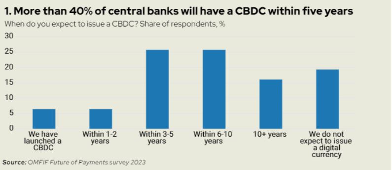 작년 12월13일 영란은행 산하 싱크탱크 '공적통화금융기구포럼(OMFIF)'이 진행한 설문조사에서는 중앙은행의 약 41%가 2028년까지 CBDC 출시를 예상한다고 답했다. 재작년 응답률 36%에서 5%p 증가한 수준이다.