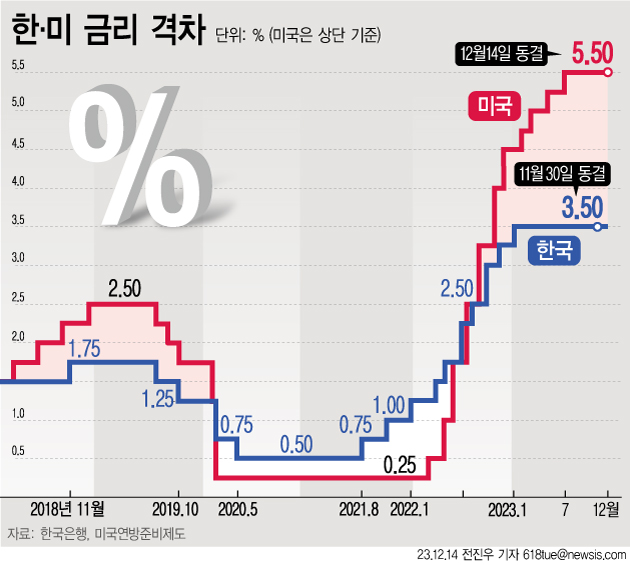 미국 연방준비제도(Fed)가 지난 달 FOMC(연방공개시장위원회) 회의에서 정책금리를 동결한 점도 금리 결정에 영향을 미칠 것으로 보인다. 여기에 지난해 12월 소비자물가 상승률도 3.2%로 여전히 3%를 웃돌고 있어 고금리 기조를 이어나가야 하는 상황이다.
