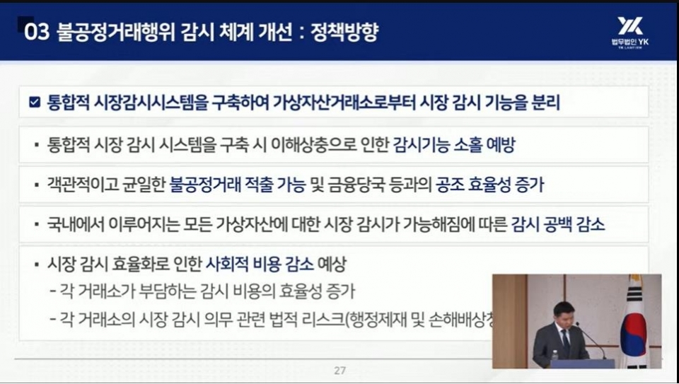 이에 대해 최 변호사는 "통합적 시장감시 시스템을 구축해 가상자산 거래소로부터 시장감시 기능을 분리해야 한다"며 "통합적 시장 감시 시스템을 구축하면 이해 상충으로 인한 감시 기능 소홀을 예방할 수 있다"고 언급했다.