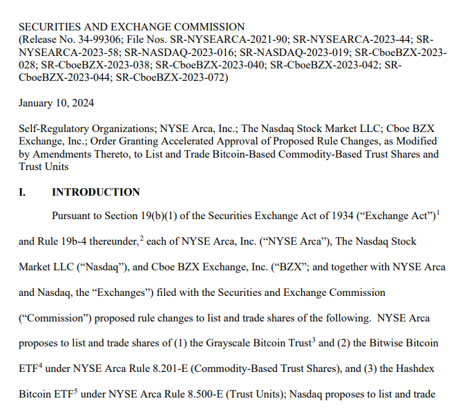10일(현지시간) 미국 증권거래위원회(SEC)는 게리 겐슬러 SEC 위원장의 명의로 발표한 성명에서 "이날 위원회는 현물 비트코인 상장지수상품(ETP) 다수의 상장과 거래를 승인했다"고 밝혔다.