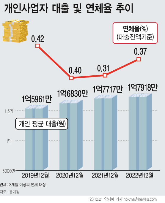 통계청이 지난해 12월21일 내놓은 '2022년 일자리행정통계 개인사업자 부채(잠정)' 자료에 따르면 2022년 12월 말 기준 개인사업자 평균 대출액은 1억7918만원으로 전년(1억7717만원)보다 1.1%(201만원) 증가했다.