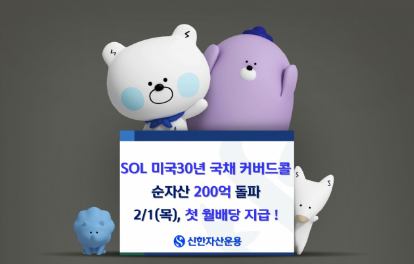 [이지경제=정석규 기자] 신한자산운용은 지난해 12월 27일 상장한 ‘SOL 미국30년 국채 커버드콜(합성)’ 상장지수펀드(ETF)가 순자산 200억원을 돌파했다고 17일 밝혔다.