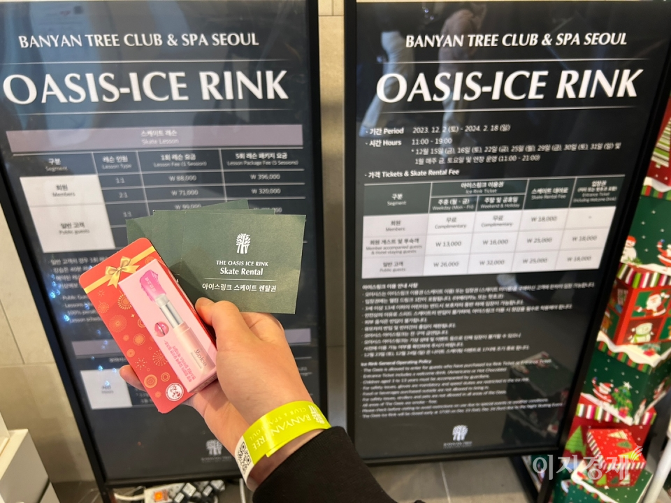 오아시스 아이스링크는 오는 18일까지만 운영되며, 매일 오전 11시부터 오후 7시까지 열려 있다. 회원은 아이스링크 이용이 무료다. 스케이트 대여료만 지불하면 된다. 투숙객과 일반 고객의 이용 요금도 차이가 있으니 자세한 내용은 홈페이지를 참고하면 된다.